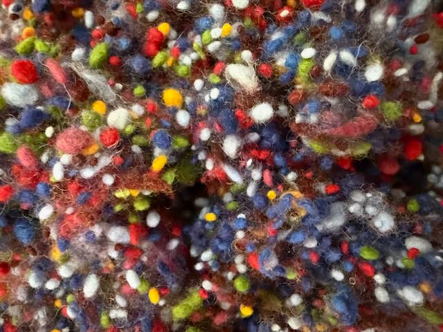 En effet, ses boutons de couleur sont exclusivement composée de laine naturelle teinte. La fibre principale est teinte en bourre, avant d'être transformée en fil, et les boutons sont ajoutés sur une matière déjà pigmentée. Ce procédé de teinture de matière première plutôt que de pigmentation d'un fil permet également de créer pour chaque passe de teinture 3 coloris subtilement dégradés, en diluant la bourre teinte avec de la bourre écrue. Ce choix délibéré de mode de fabrication plus contraignant permet de réduire les opérations de teinture, et donc leur impact écologique, tout en garantissant des assemblages de coloris cohérents et ça nous aimons tous!