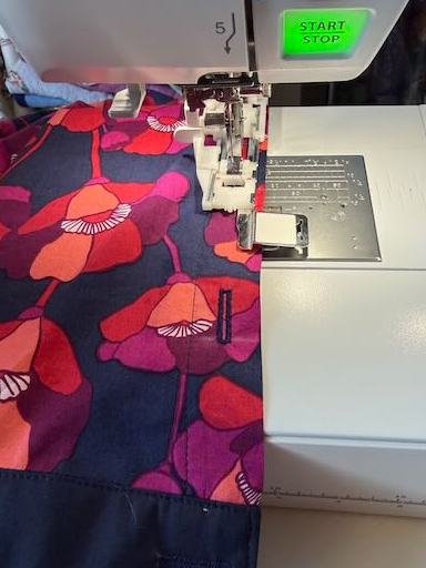 J'ai pris ma chute de coupon de 3m en popeline de coton, du fil bleu marine, du thermocollant H200, du support droit fil thermocollant, des cones de surjeteuse bleu, des boutons rouges de ma réserve.