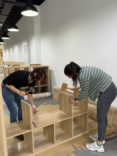 Dès 9h, on s'active avec l'équipe des amis pour monter (pour les amateurs d'Ikea) 20 armoires billy, des kallax, des tables, des chaises, deux comptoirs,... On attache des panneaux muraux... Quelle équipe!