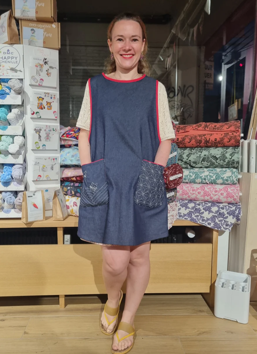 Mon tablier japonais aux poches décorées de sashiko, motifs créés pour l'occasion