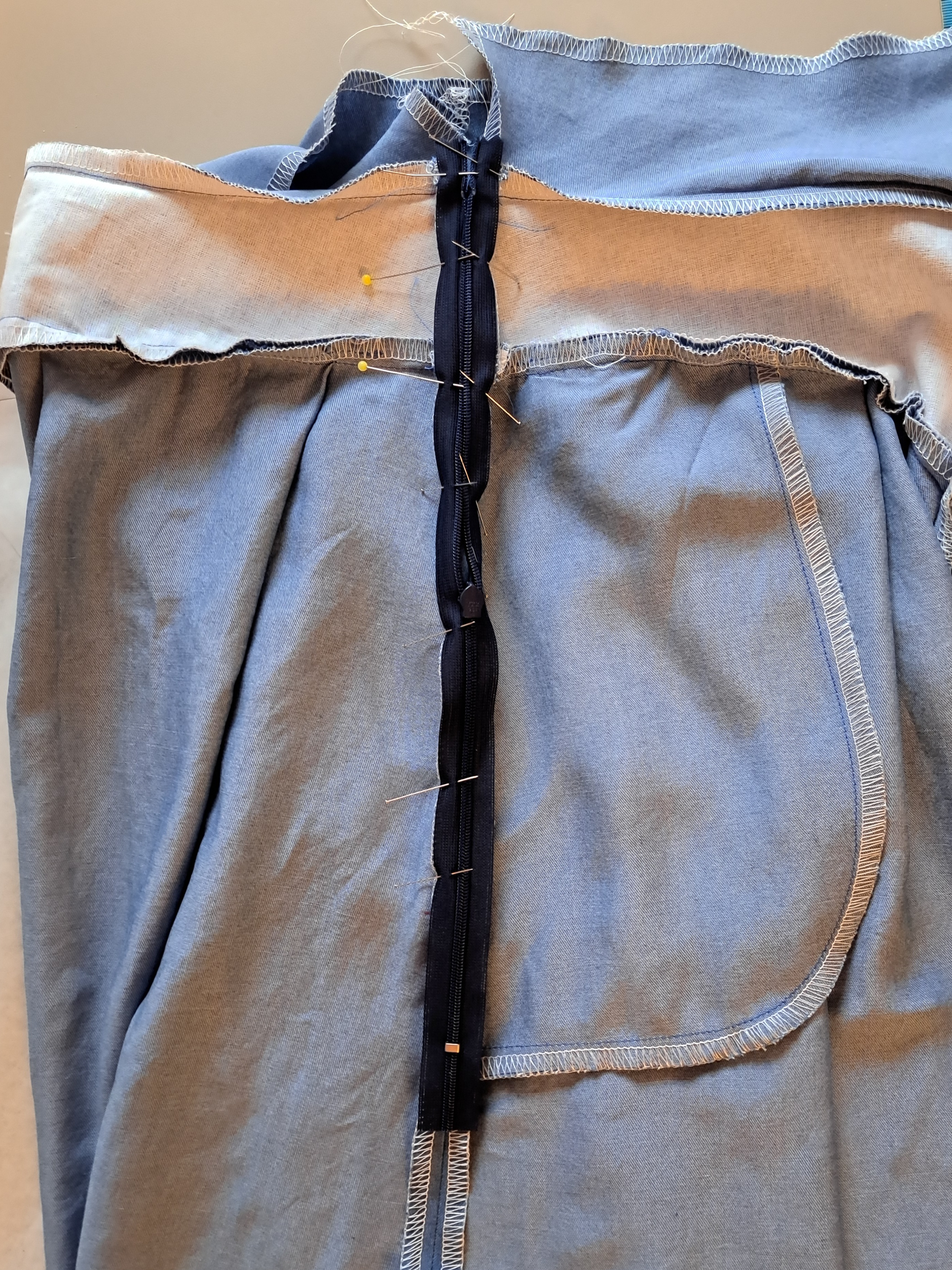 J'ai du m'y reprendre deux fois pour la pose de la ceinture car des plis disgracieux se sont créés entre la ceinture et les plis plats. Heureusement que les découd-vite existent! J'en profite pour dire que ceux-ci sont très agréables à utiliser avec leur grand manche qu'on a bien en main.