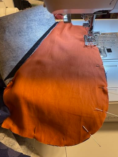 Au moment de l'essayage, je trouvais que mon pantalon avait presque déjà la bonne longueur sans ourlet, qu'à cela ne tienne, j'ai fait une finition au biais orange pour un rappel du sac de poche;