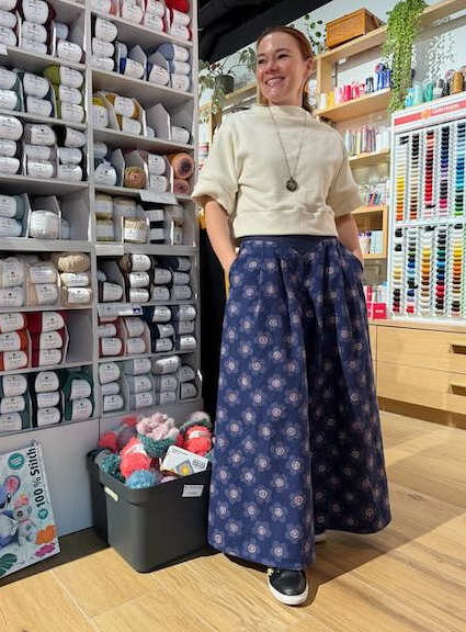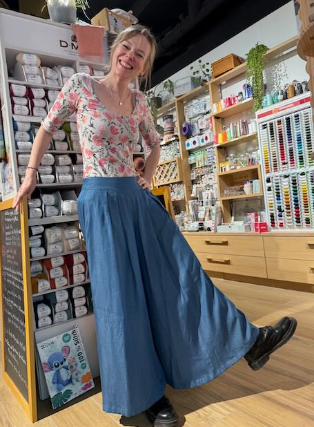 Je suis partie sur un superbe tencel bleu jeans de la boutique. Ce tissu, Eugénie l'avait rentré depuis un certain temps et c'est devenu un classique de la boutique. Je savais que j'allais me coudre un vêtement dedans, mais je n'avais pas encore trouvé le patron. Avec Sanaz, j'y ai tout de suite repensé. Il est fluide, avec un beau tombé, une belle nervosité quand il bouge. L'ampleur des jambes le met vraiment bien en valeur.