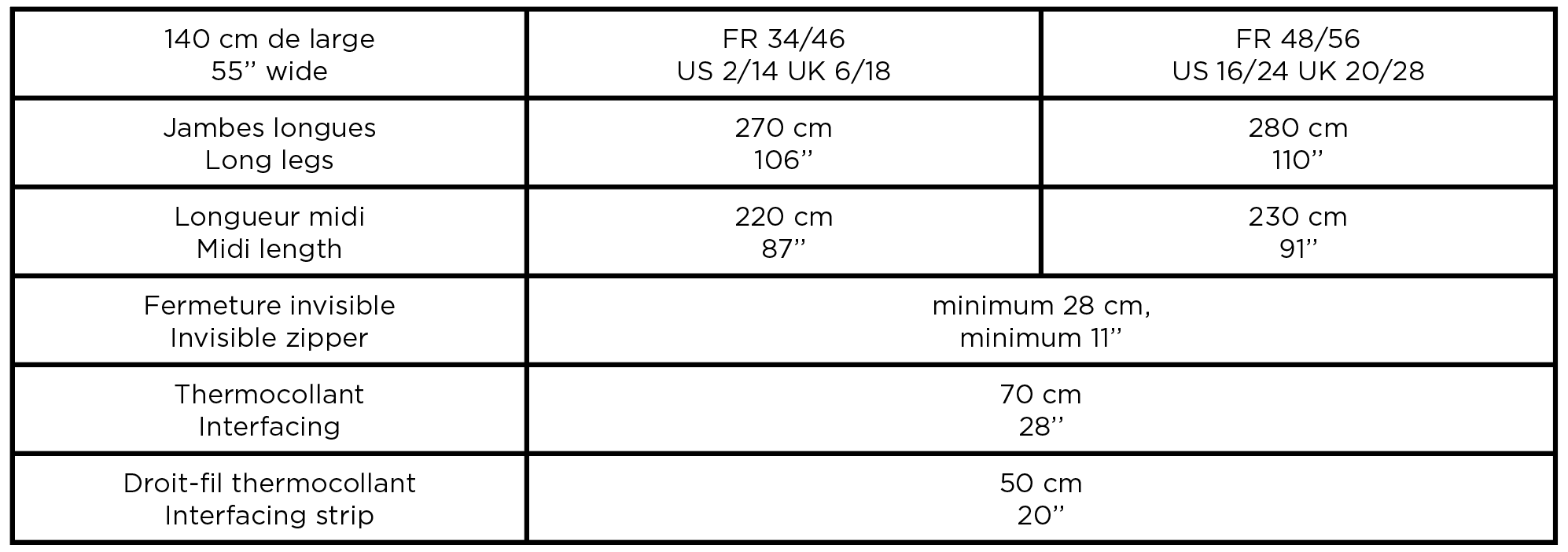 Voici le tableau récapitulatif des besoins en tissus et matériel pour coudre Sanaz: