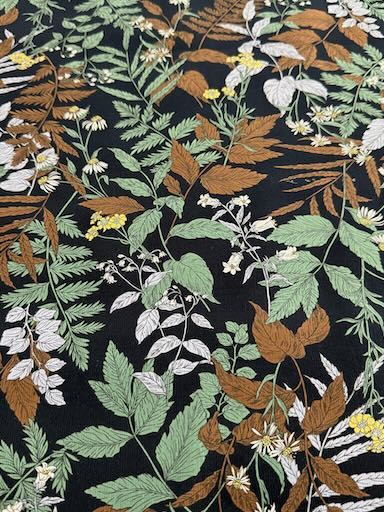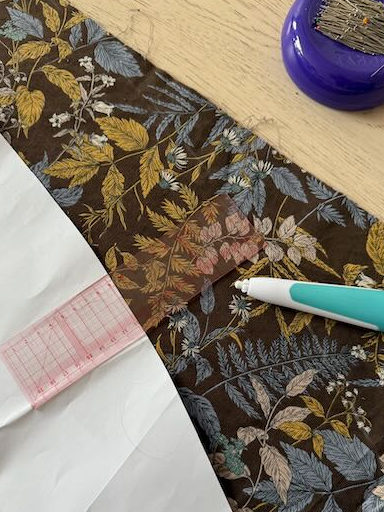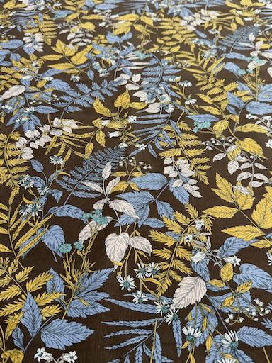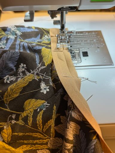 J'ai choisi un fil foncé et une tirette chocolat pour assortir au tissus. Quant au biais d'encolure, je me suis amusée à choisir un caramel rappelant la couleur des fleurs.