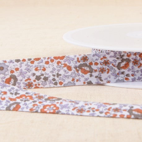 Biais de toute belle qualité au motif de petites fleurs. Il est disponible en 3 couleurs et est produit en France.