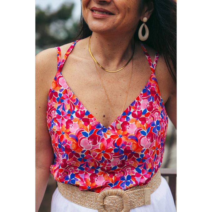 - Le top AVA , le débardeur intemporel , aux encolures féminines et au jeu de bretelles croisées dans le dos