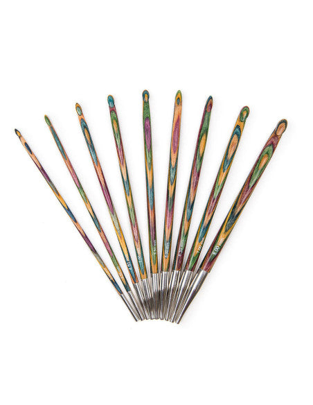 Les crochets tunisiens/afghans Symfonie de KnitPro sont légers, mais exceptionnellement solides et durables. La combinaison de couleurs vives avec le bois les rendent particulièrement attrayants. La surface en bois poli permet une glisse sans effort avec tout type de fil, procurant des heures de tricot agréable sans fatigue des mains !