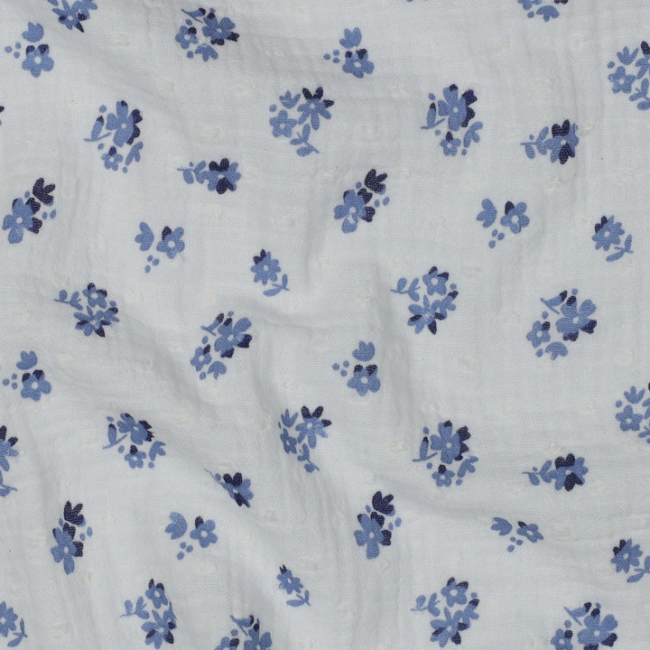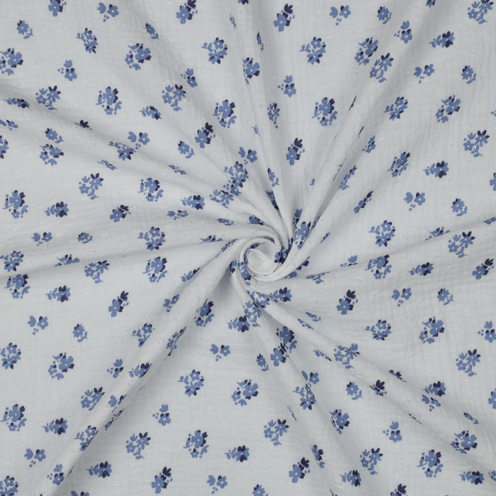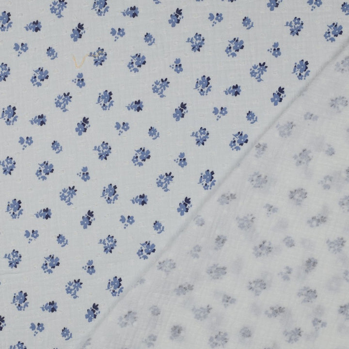 Superbe double gaze au motif de jolies petites fleurs bleues sur fond blanc, un motif romantique et tout doux...