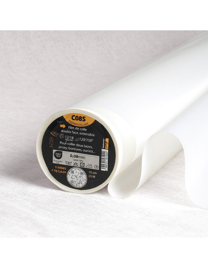 Film extensible thermocollant double face. Il permet de coller deux laizes de tissus, de faire des ourlets, des bordures ... sur tous les tissus extensibles comme le jersey. Conserve l'élasticité du tissu.