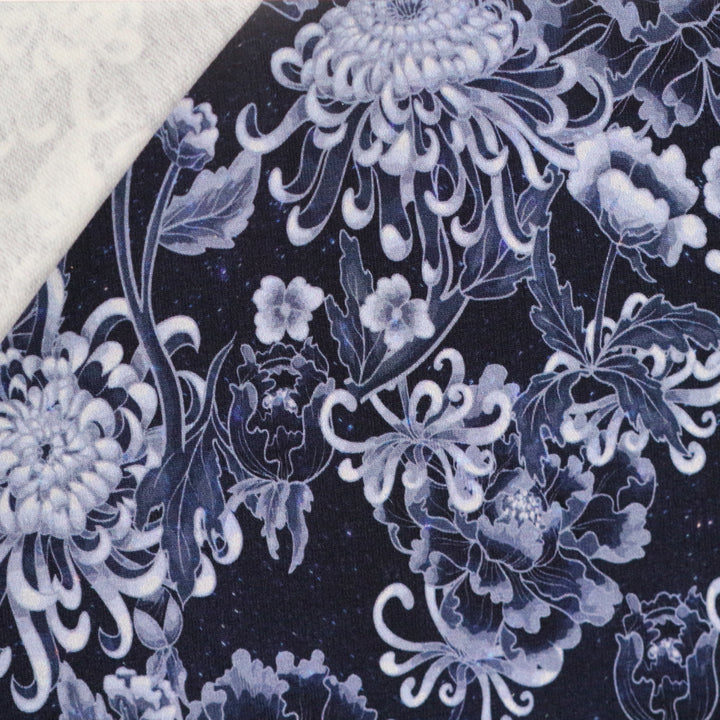 French terry chrysanthèmes bleus certifié oeko-tex (prix pour 10cm)