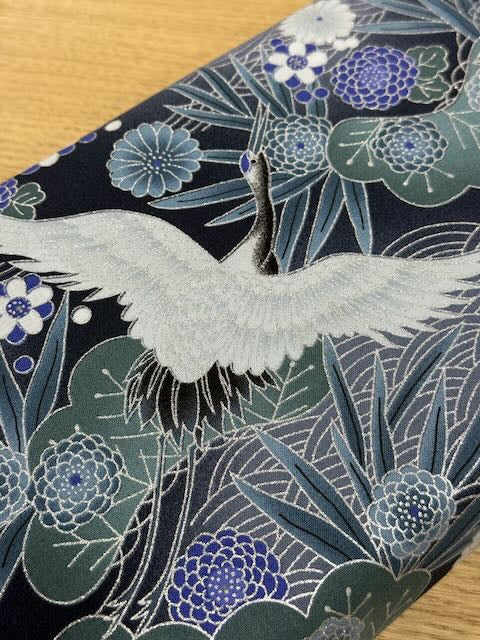 - motifs de grues grises, fleurs et végétaux dans les tons bleu relevés de traits argentés bien présents
