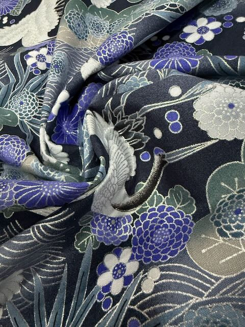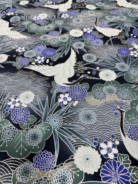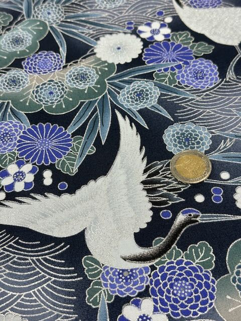 Grues et fleurs bleu indigo très foncé- argent - 100% coton (par unité de 10cm)