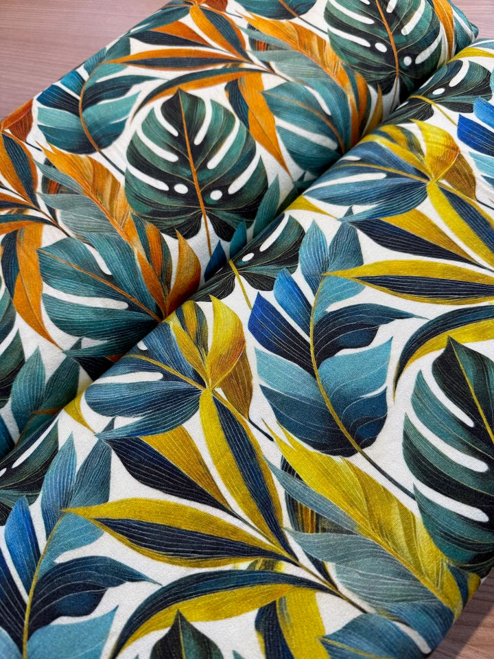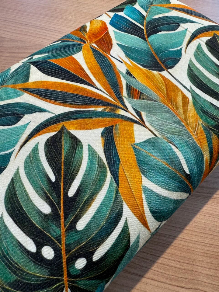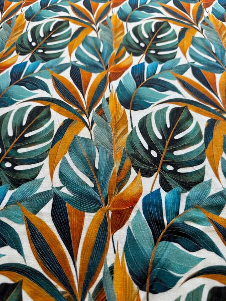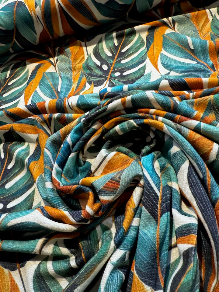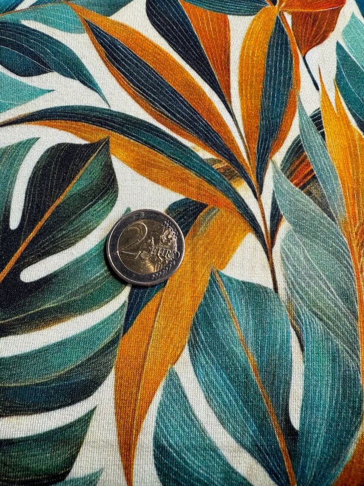 Jersey de viscose - jungle tropicale vert/orangé certifié Oeko-tex (prix pour 10cm)