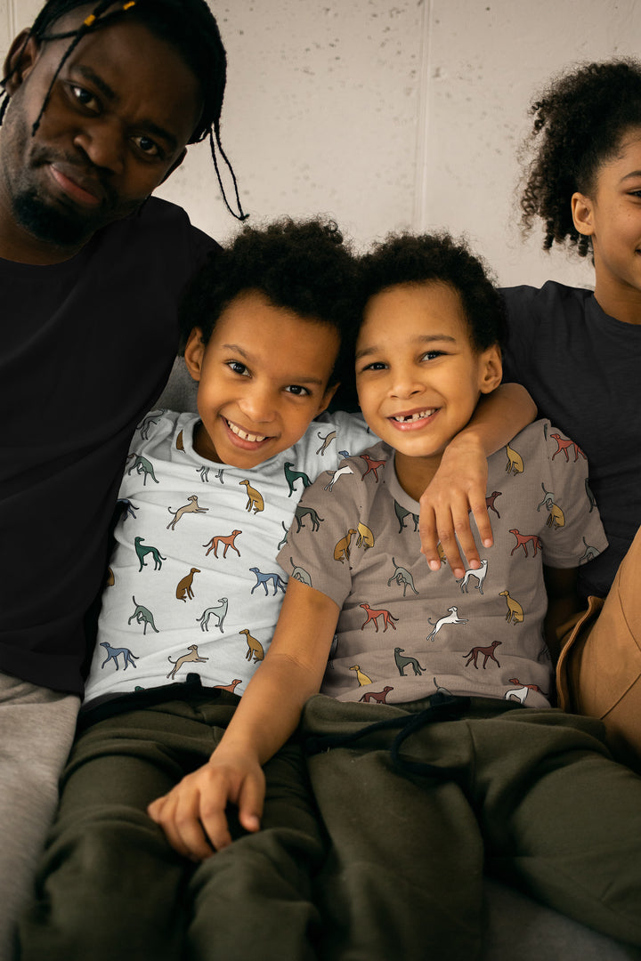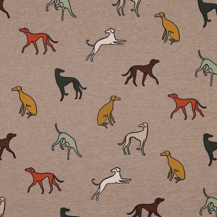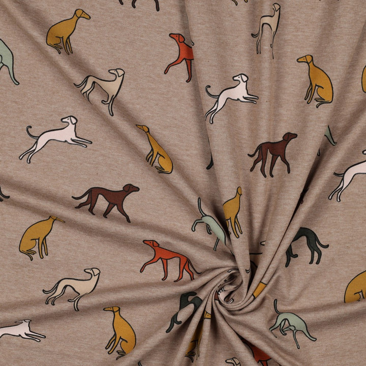 Jersey "lévriers sur fond cappuccino" certifié oeko-tex (prix pour 10cm)