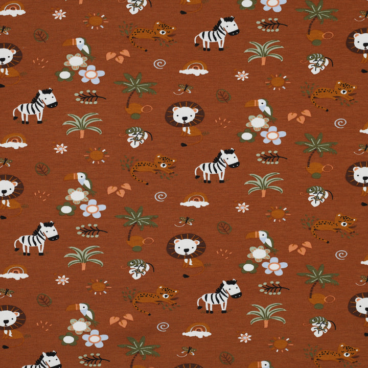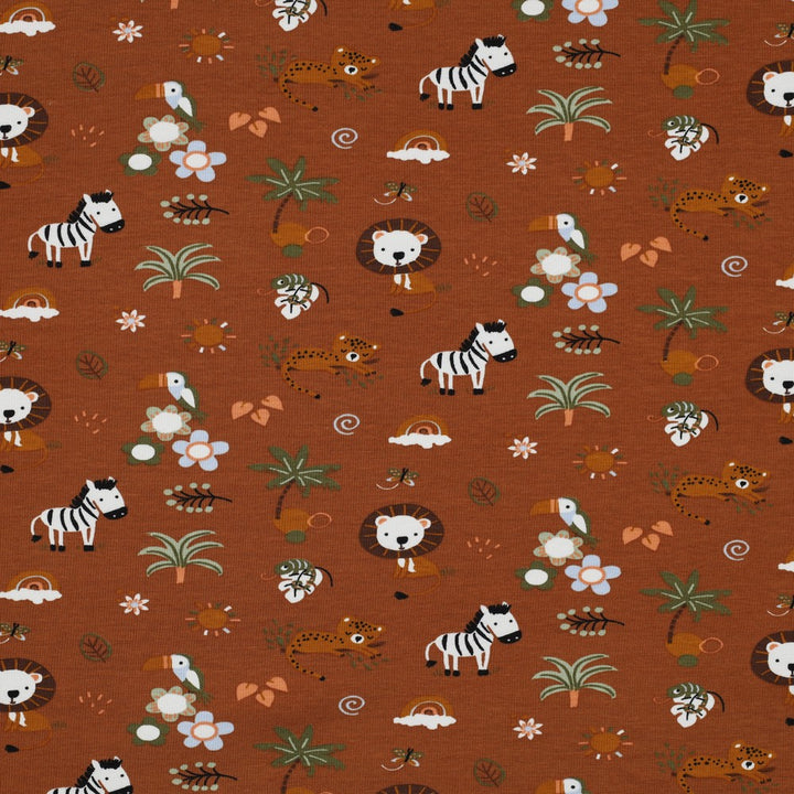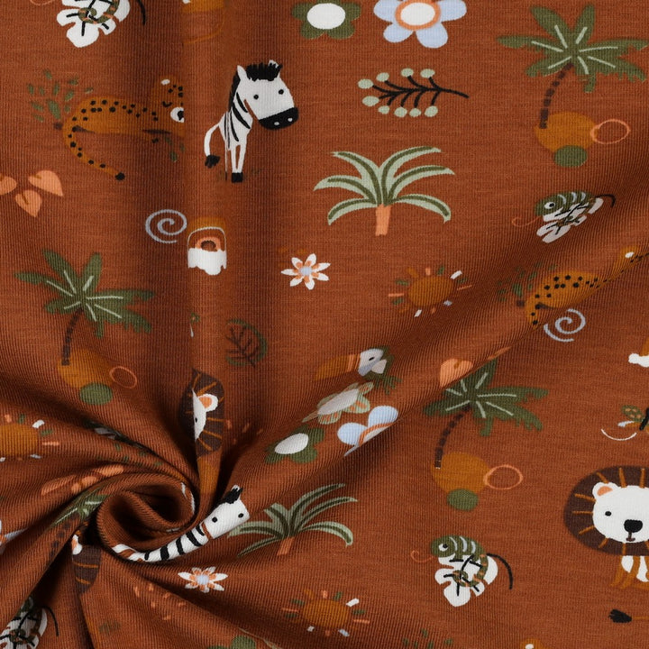 Jersey "Safari sur fond moka" certifiée oeko-tex (prix pour 10cm)
