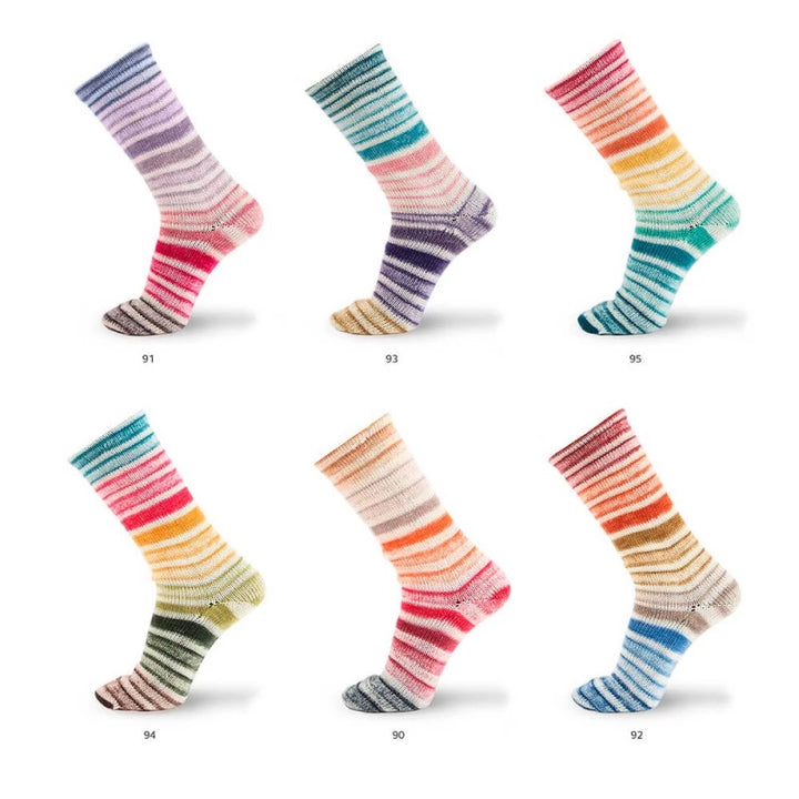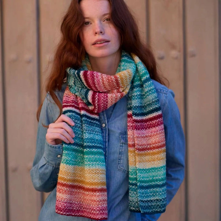 Chaque pelote de 80 grammes et 320 mètres est suffisante pour tricoter une paire de chaussettes symétriques ou un col empreint de style. Le fil change de couleur, formant un motif élégant et captivant.
