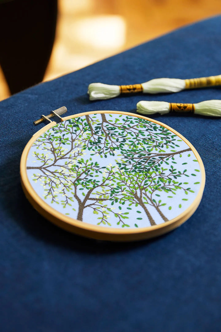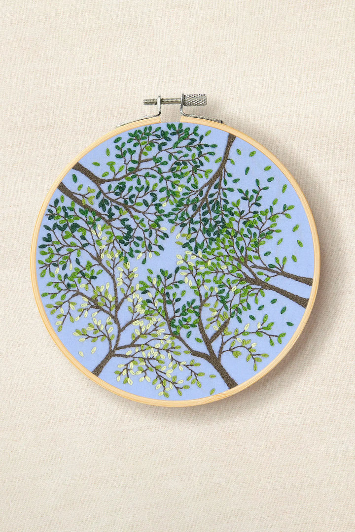 Brodez une canopée d’arbres avec ce kit complet signé Nathalie Weinzaepflen. La toile bleue pré-imprimée met en valeur les tons verts des feuilles pour une finition harmonieuse.
