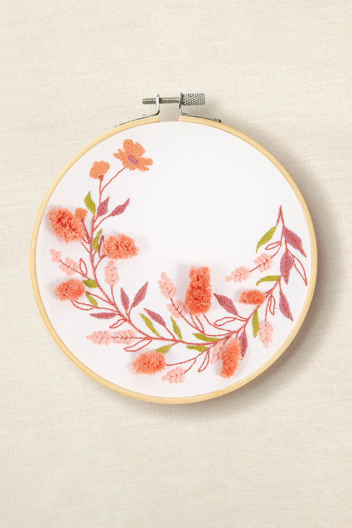 Ce motif floral de Pascaline Latasse s’inspire des fleurs séchées et utilise le point de Turquie pour un effet 3D, le point granitos pour une texture riche, ainsi que d’autres points apportant détail et profondeur. C’est une pièce unique qui sera superbe encadrée sur un mur.