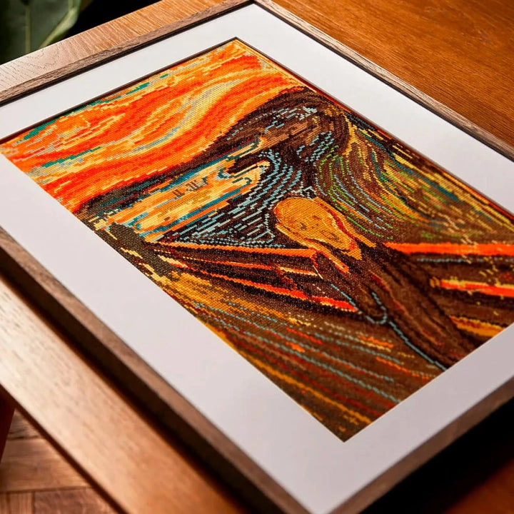 Une fois terminé, votre broderie mesurera environ 28,6 x 36 cm, un format idéal pour l'encadrer et en faire une pièce décorative unique qui évoquera l'intensité émotionnelle et le symbolisme de Munch dans votre propre maison.