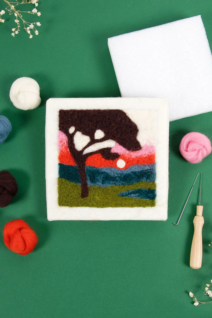 Créez un magnifique coucher de soleil sur les champs grâce à ce kit de feutrage de Marie Dominique Procureur. Tout ce dont vous avez besoin pour réaliser ce projet est inclus, de la laine cardée de haute qualité aux instructions étape par étape.