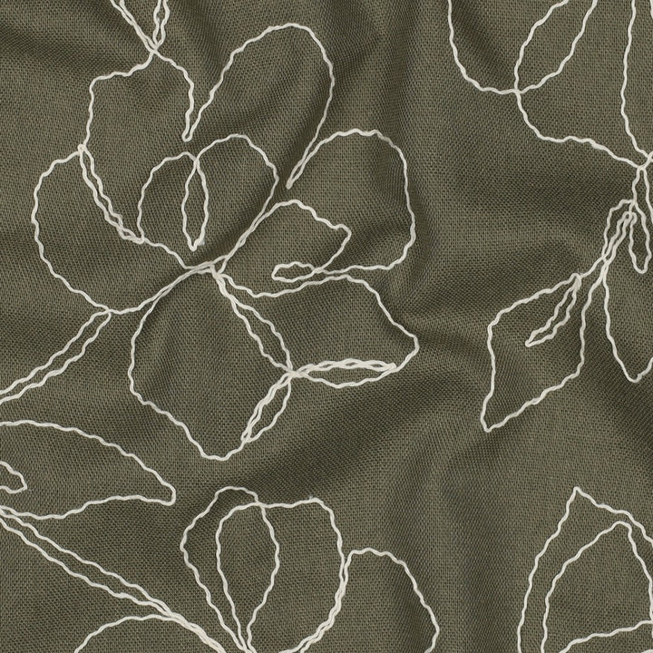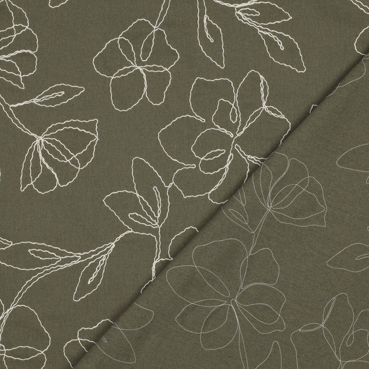 Lin - viscose brodé camélia sur fond vert (prix pour 10cm)