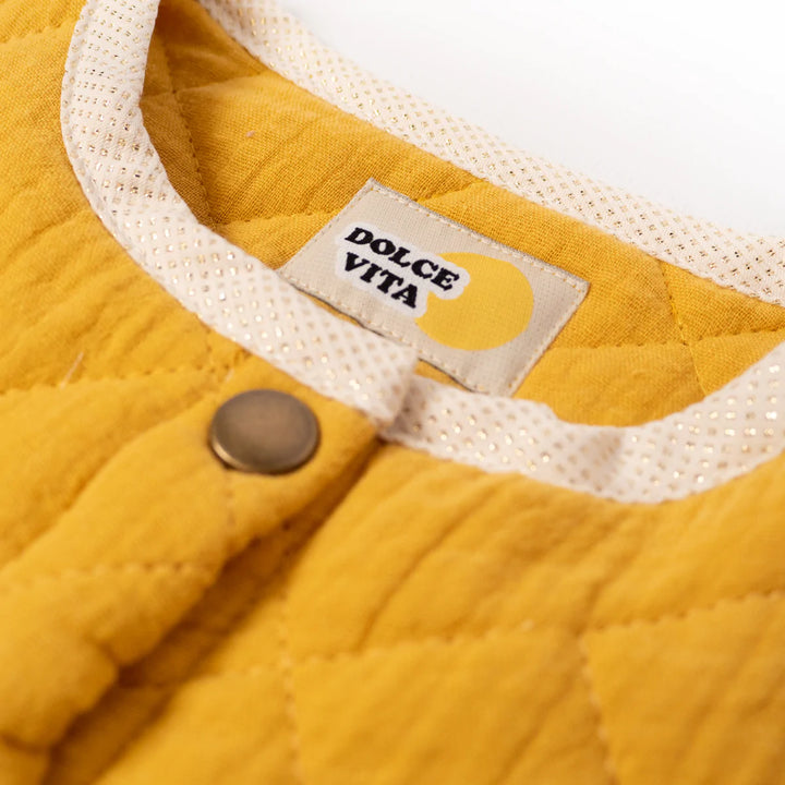 - Étiquette écrue, écriture noire et blanc, soleil jaune.