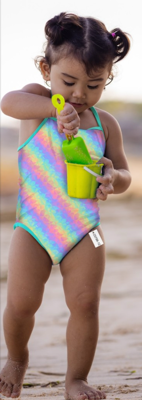 Le tissu pour maillot de bain with love est très fun avec son motif multicolore.