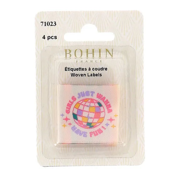 Paquet de 4 étiquette tissée à coudre Bohin - girls just wanna have fun ( prix pour le paquet de 4)