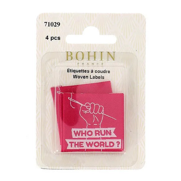 Paquet de 4 étiquette tissée à coudre Bohin - Who run the world ( prix pour le paquet de 4)