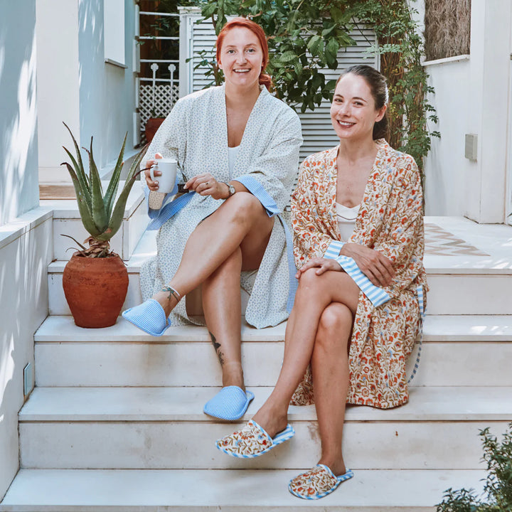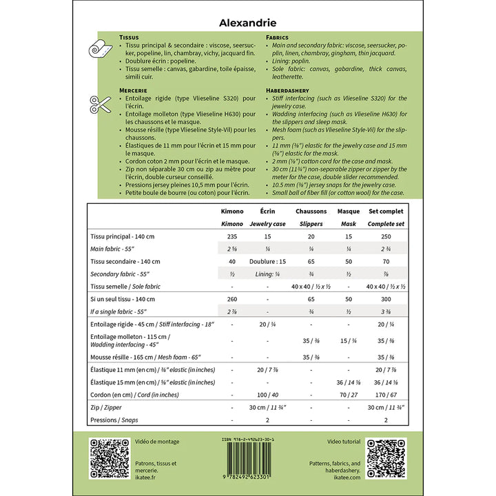 Alexandrie est un ensemble de 4 patrons pensés autour de l'univers de la chambre, pour la femme et l'homme : un kimono, des chaussons, un masque de sommeil et un écrin à bijoux. Les finitions sont soignées (coutures anglaises, rabattues, gansées, passepoilées) pour un résultat raffiné.