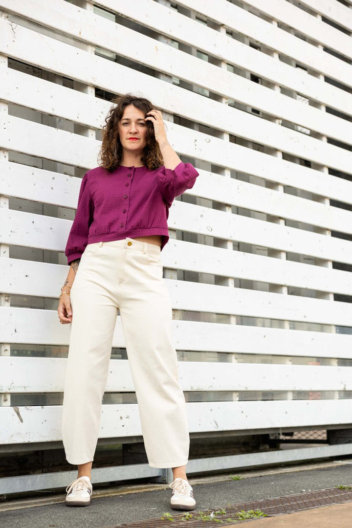 Je suis Pearl, un chemisier que vous pouvez créer en 36 versions différentes. J’ai été conçu pour offrir plusieurs options de style, tout en restant facile à adapter à vos envies.