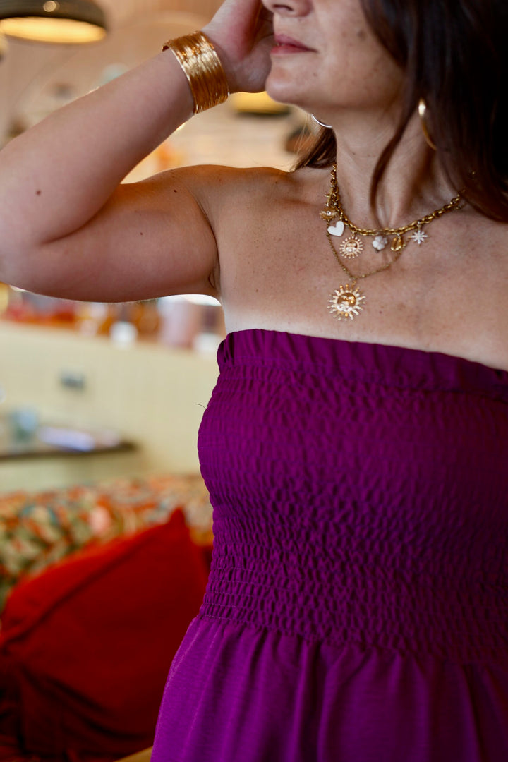 - Version A : un bustier entièrement smocké, maintenu en haut par un élastique coulissé pour un look à la fois flatteur et confortable