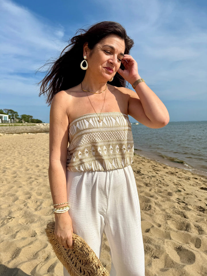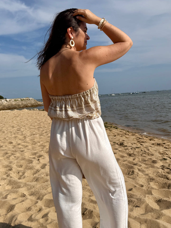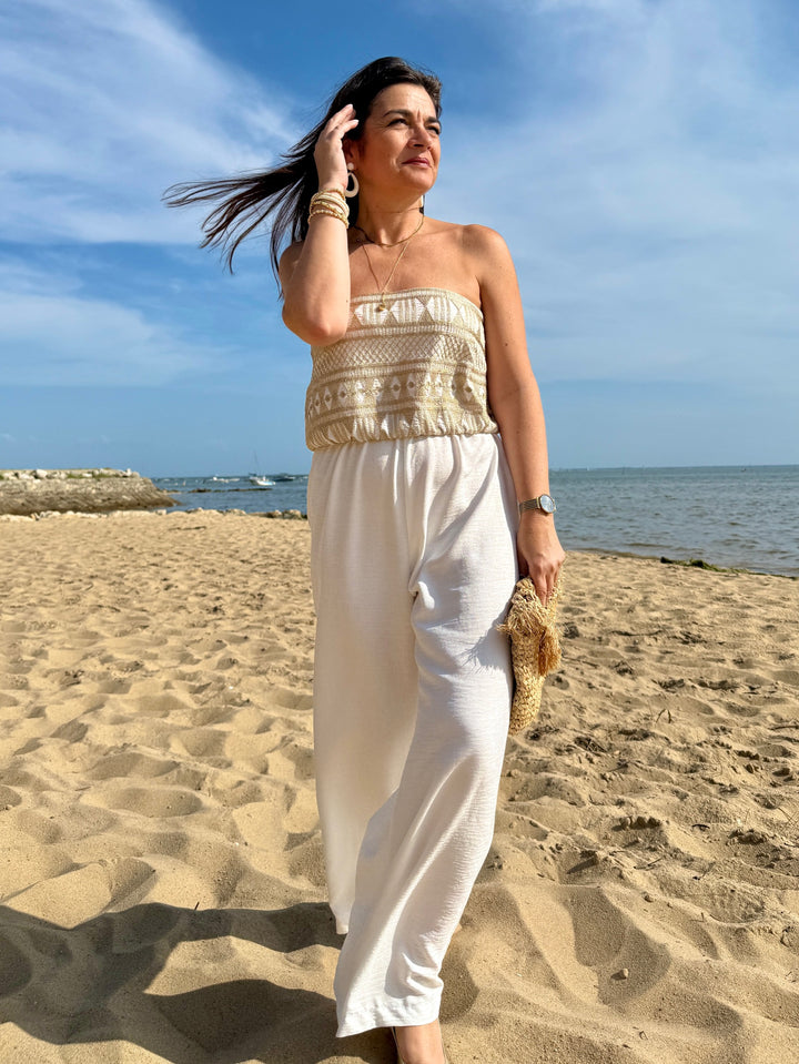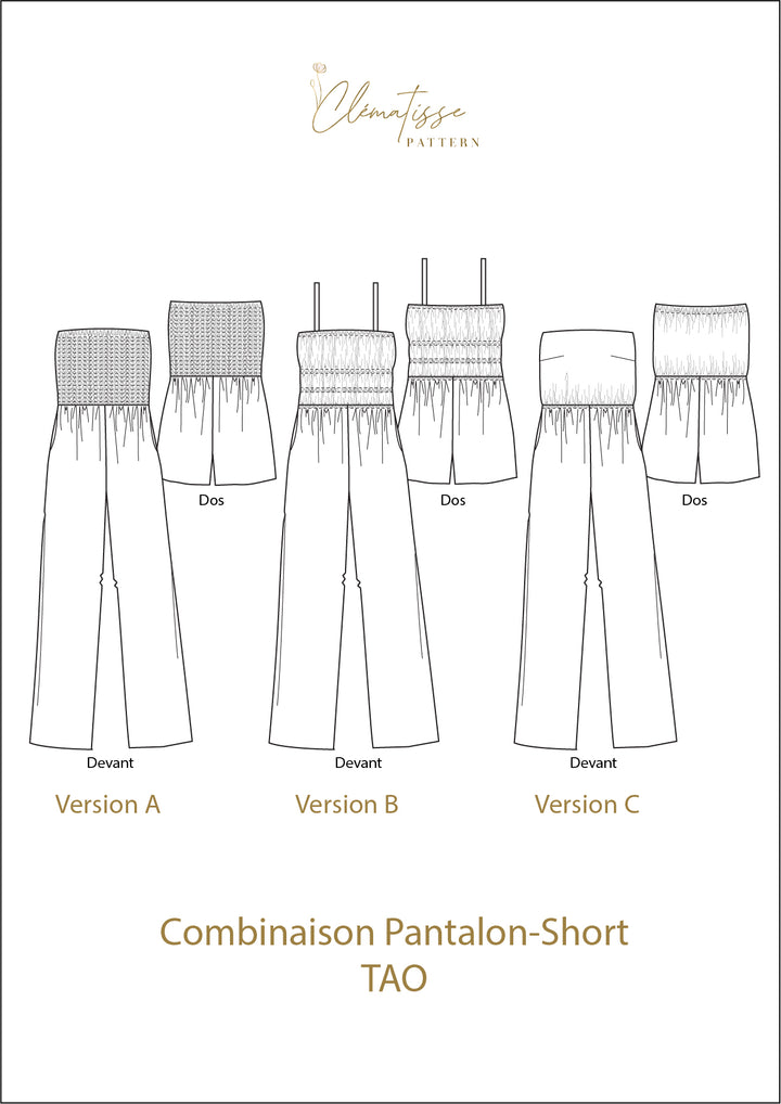 Le patron TAO combine confort et élégance avec son bustier qui dégage joliment les épaules et son volume de jambe fluide, parfait pour les beaux jours.