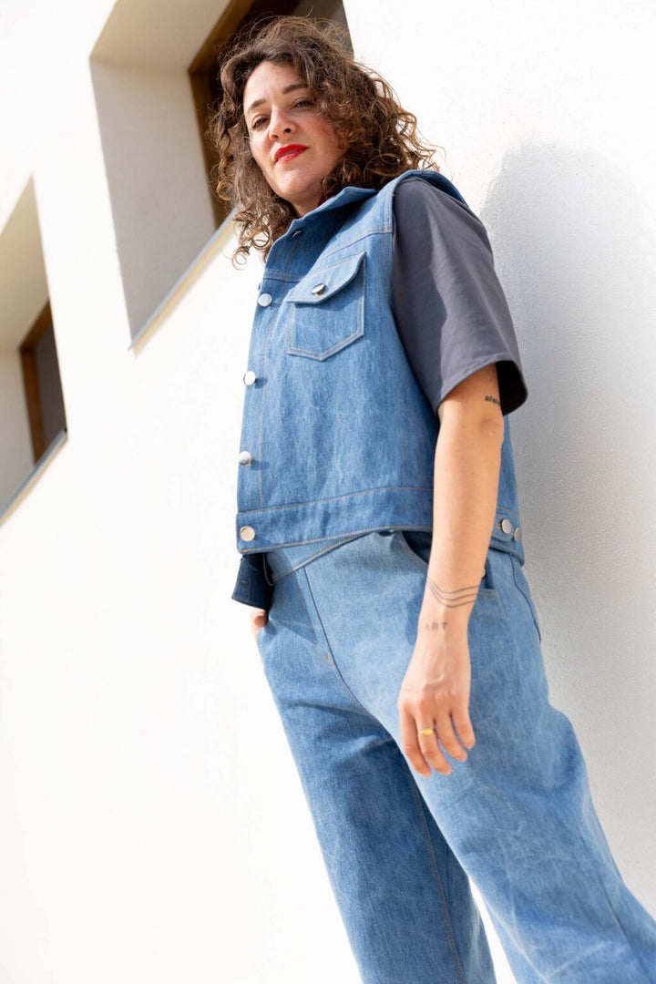 La veste de travail sans col et sans manches a été cousue dans un denim écru de notre collection privée.