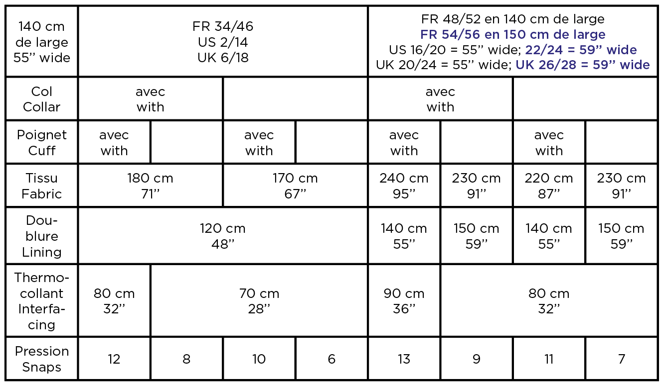 Tailles : FR 34/56, US 2/24, UK 6/28.