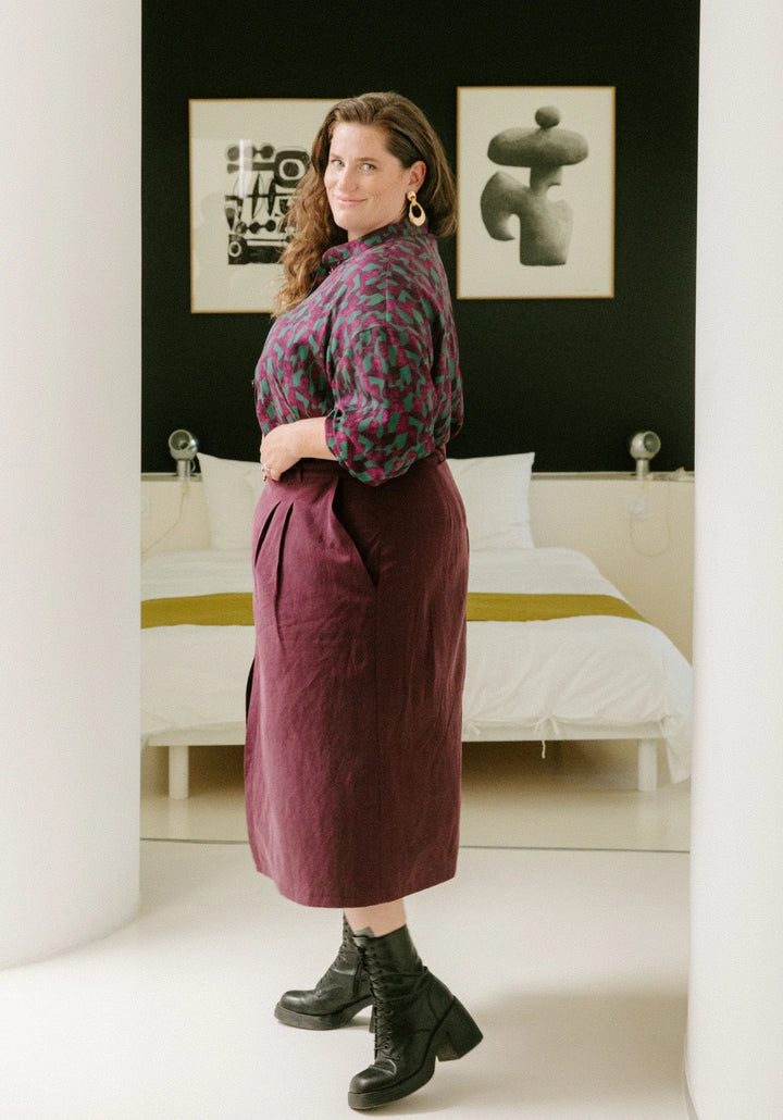 Niveau de couture : INTERMÉDIAIRE, les points techniques sont la réalisation des plis sur le devant de la jupe, le montage de la ceinture, les poches italiennes, la fente devant et la pose du zip invisible.