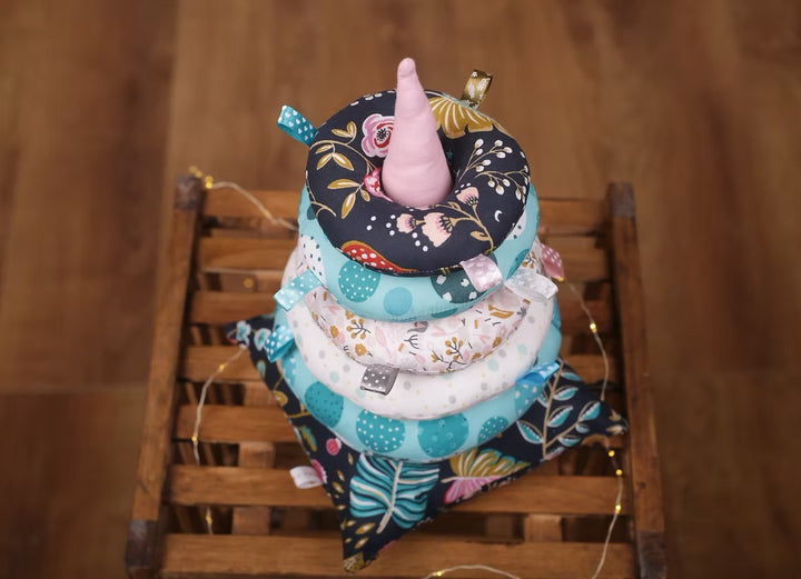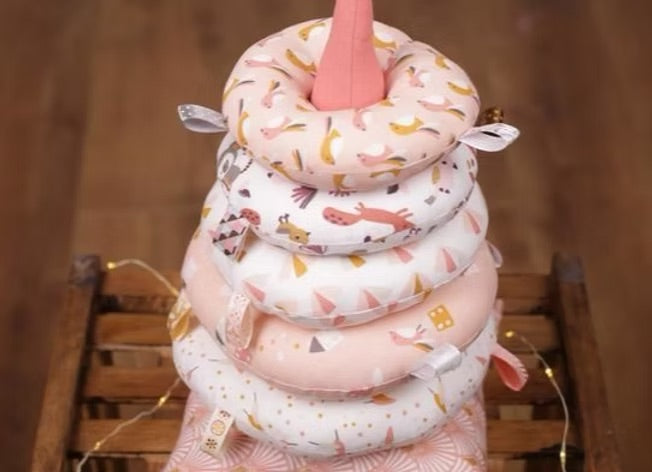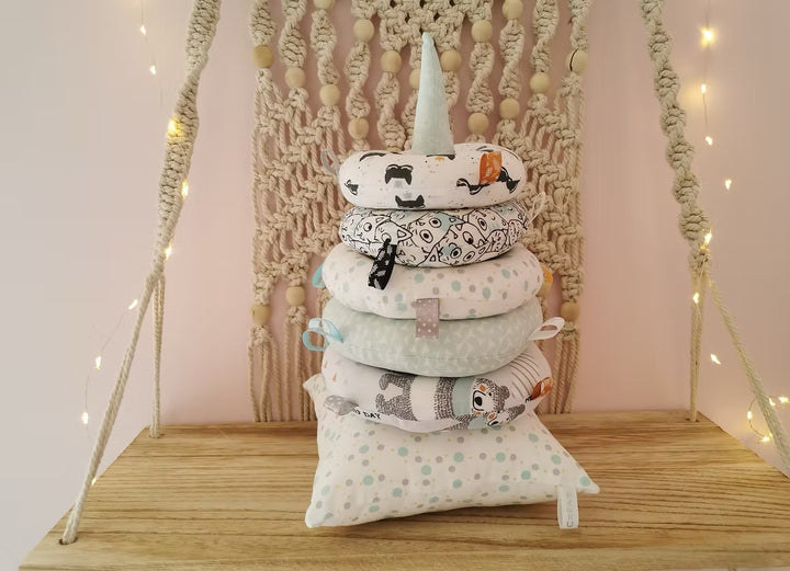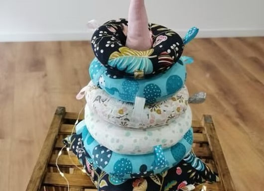 Le jeu est composé de 5 à 6 anneaux à empiler, offrant la possibilité de varier les matières et les tissus pour créer un jouet sensoriel qui stimulera les sens de votre bébé.