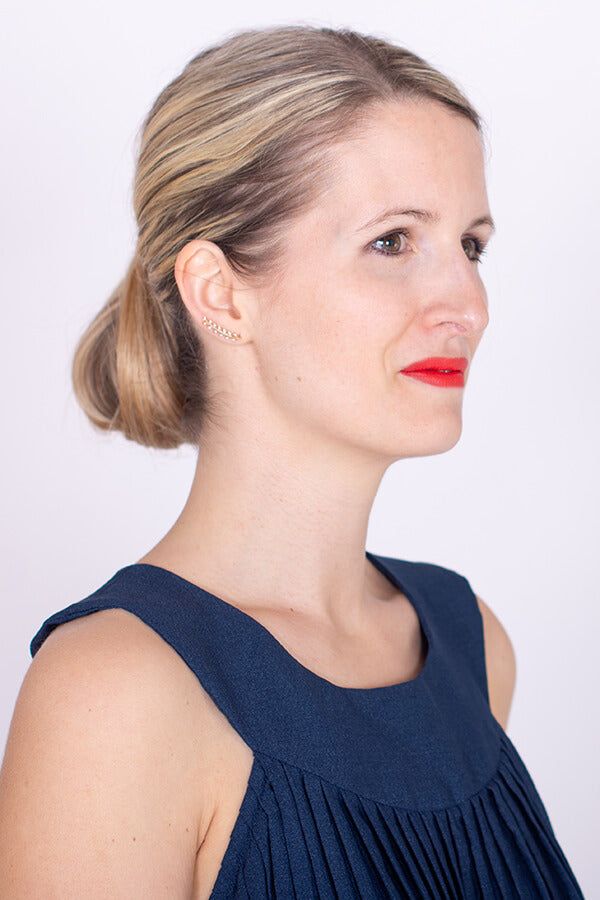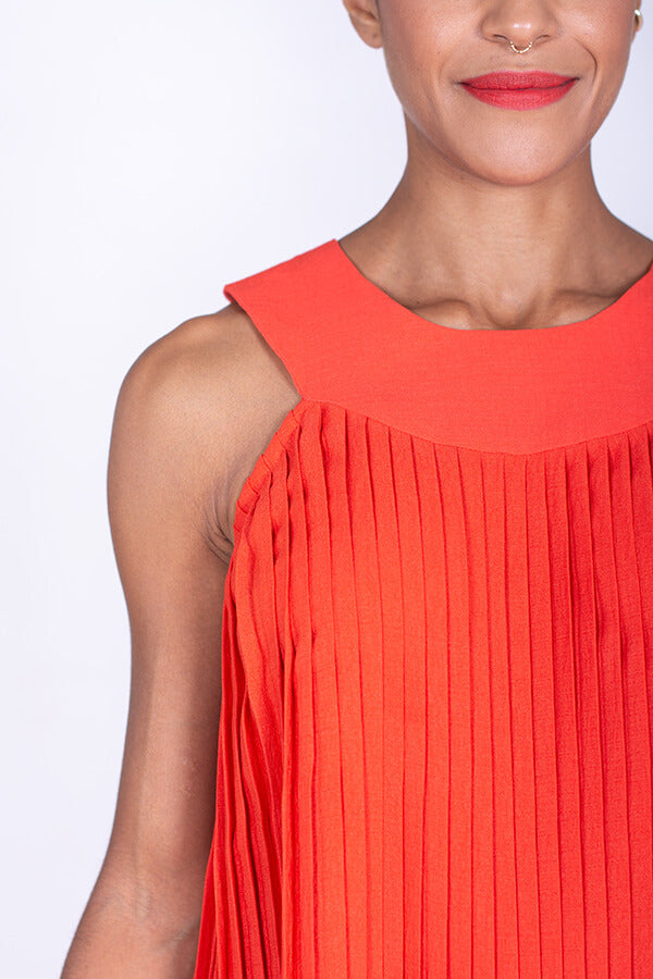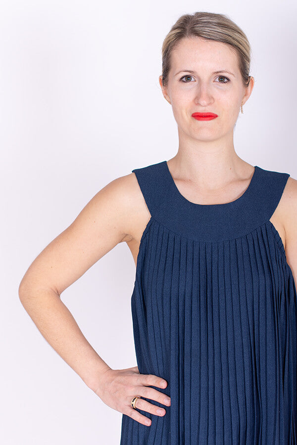 Je suis Cléopâtre, une robe plissée et je me décline aussi en petit haut. Je suis très agréable à porter grâce au tissu plissé qui me donne beaucoup d’aisance. J’ai un plastron en forme de collier d’où part le corps du vêtement en tissu plissé. J’ai des emmanchures américaines finies par un biais. Je suis à la fois très chic et extrêmement confortable.