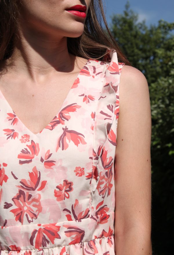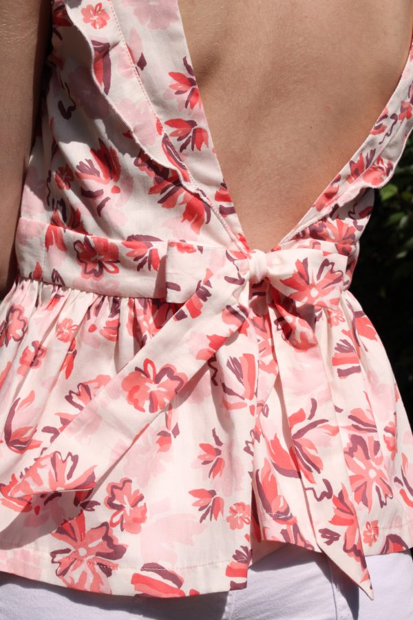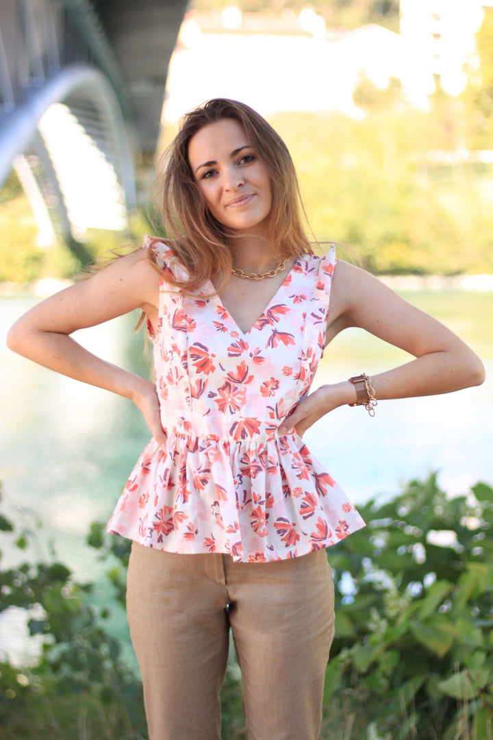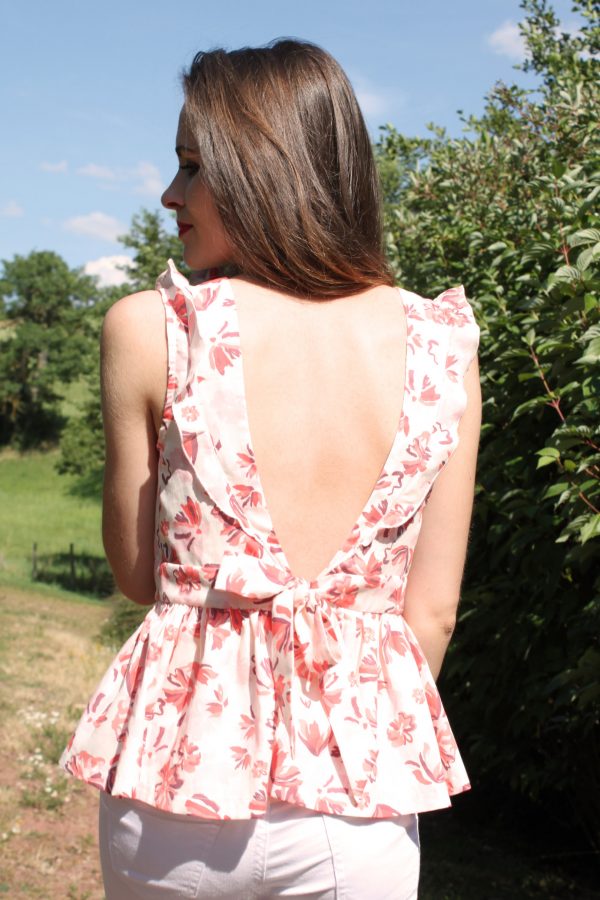 J’ai réalisé mon top dans un coton soyeux, tu peux utiliser d’autres matières, comme un chambray, du viscose, un lin, un polyester, une double gaze, une broderie anglaise, une popeline.