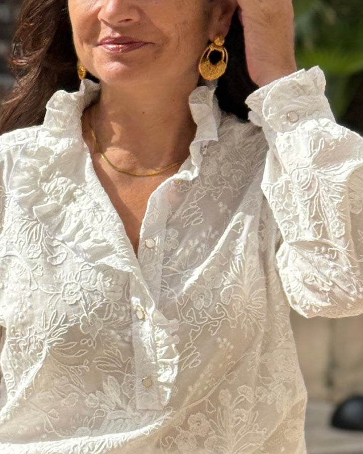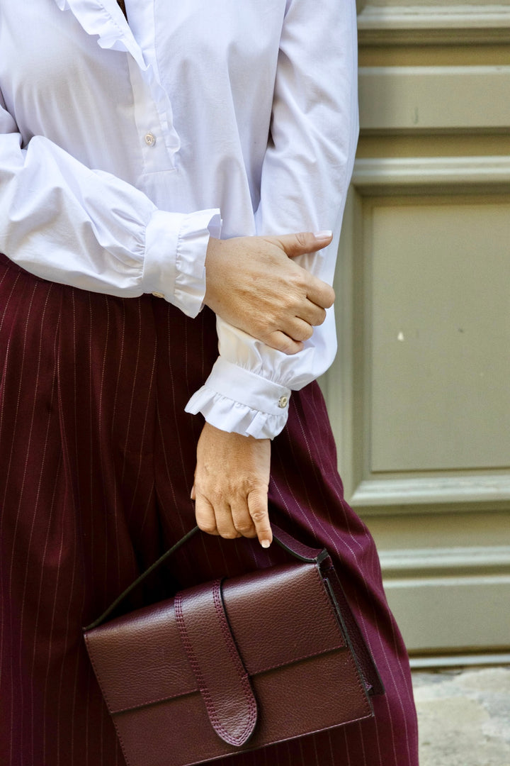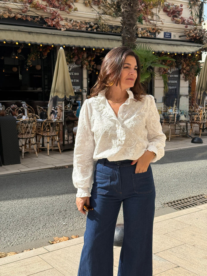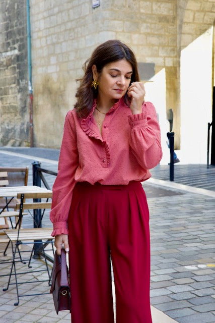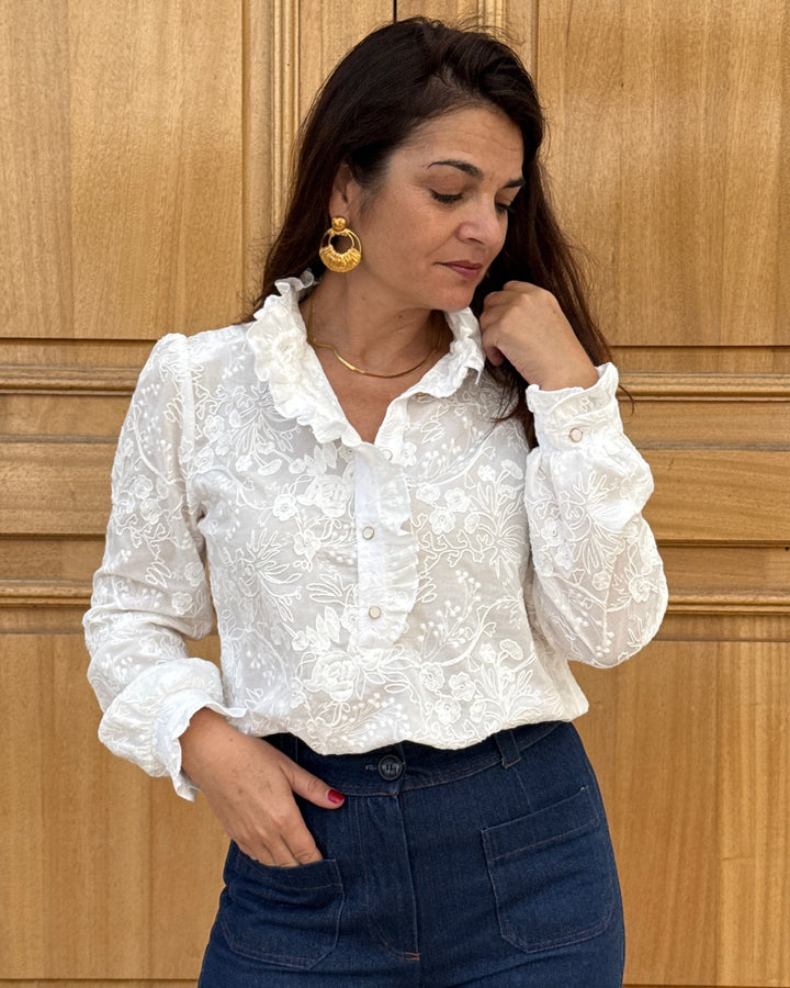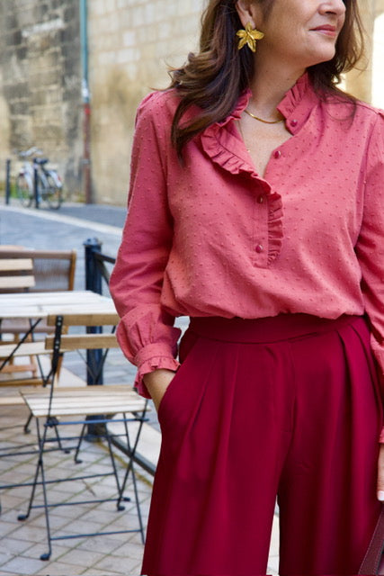 Le patron Albane se distingue par son col volanté qui court le long de la patte de boutonnage, soulignant avec délicatesse son esprit bohème.