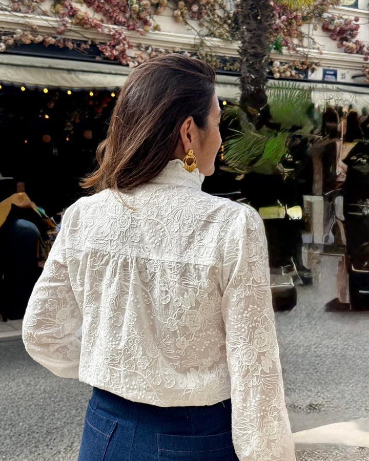Sa coupe droite, à peine cintrée, met en valeur le volume des manches légèrement bouffantes, tandis qu’aux poignets de délicats volants croisés viennent parfaire la finition raffinée.