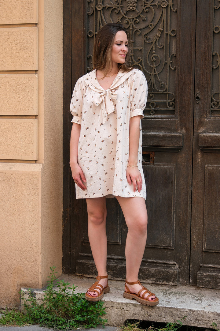 Esmée est une robe ample avec une encolure fermée par un joli nœud. Son double col viendra se poser élégamment sur les épaules.