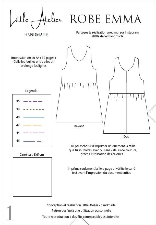 Patron de la robe Emma aux formats A0 et A4 (15 pages) et livret d'assemblage, au format PDF, UNIQUEMENT EN FRANÇAIS.