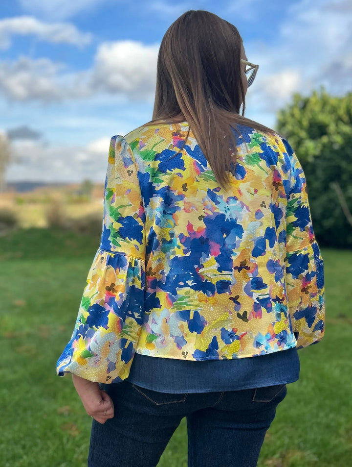 Transformez votre blouse en robe fluide à partir du buste court : il suffit d’y ajouter deux volants froncés.