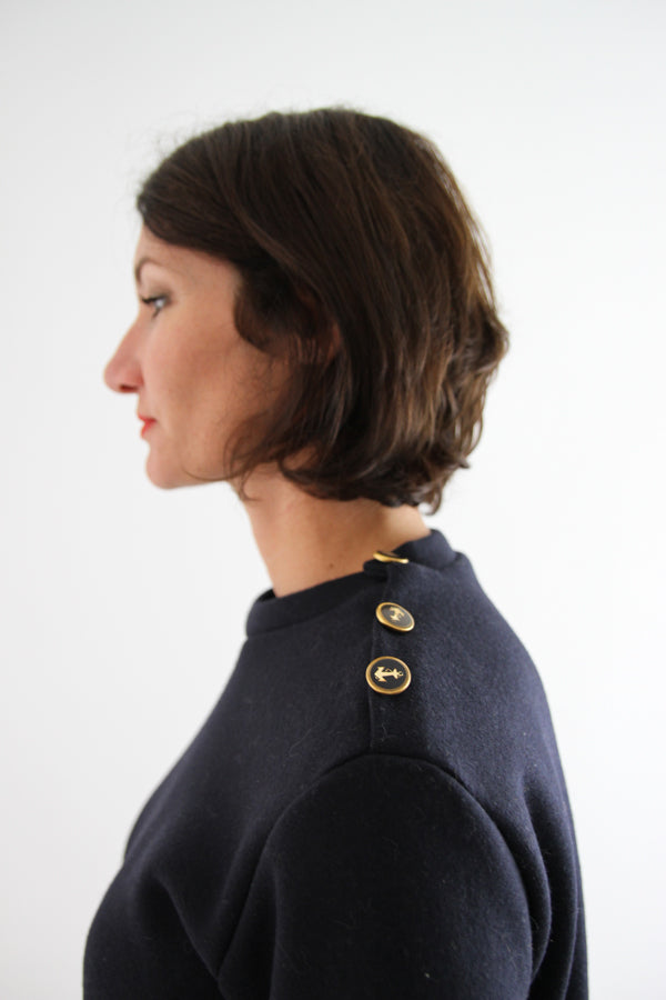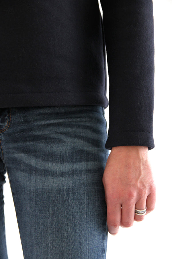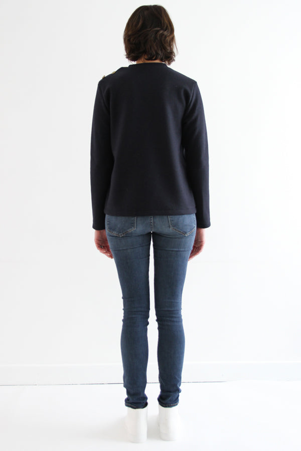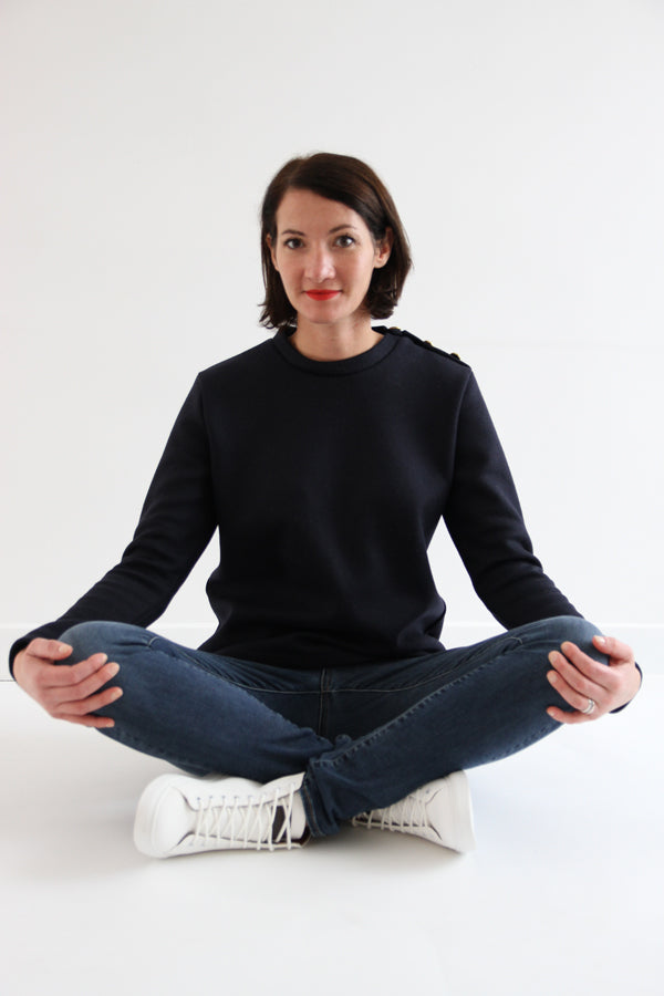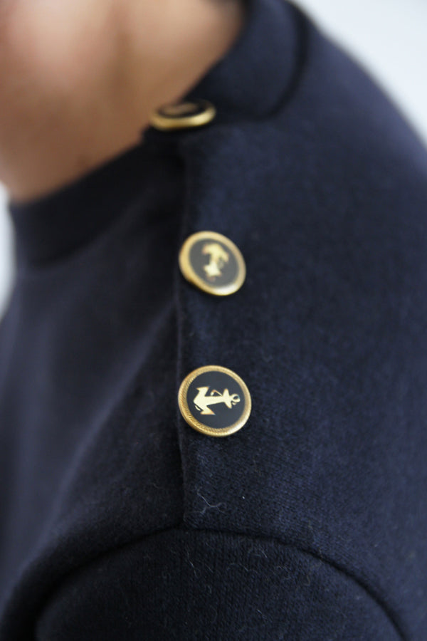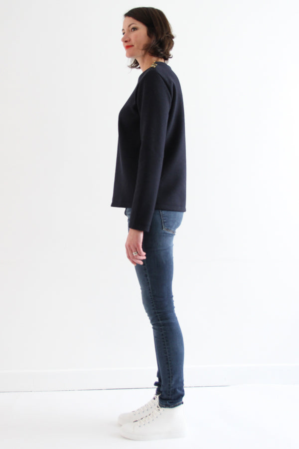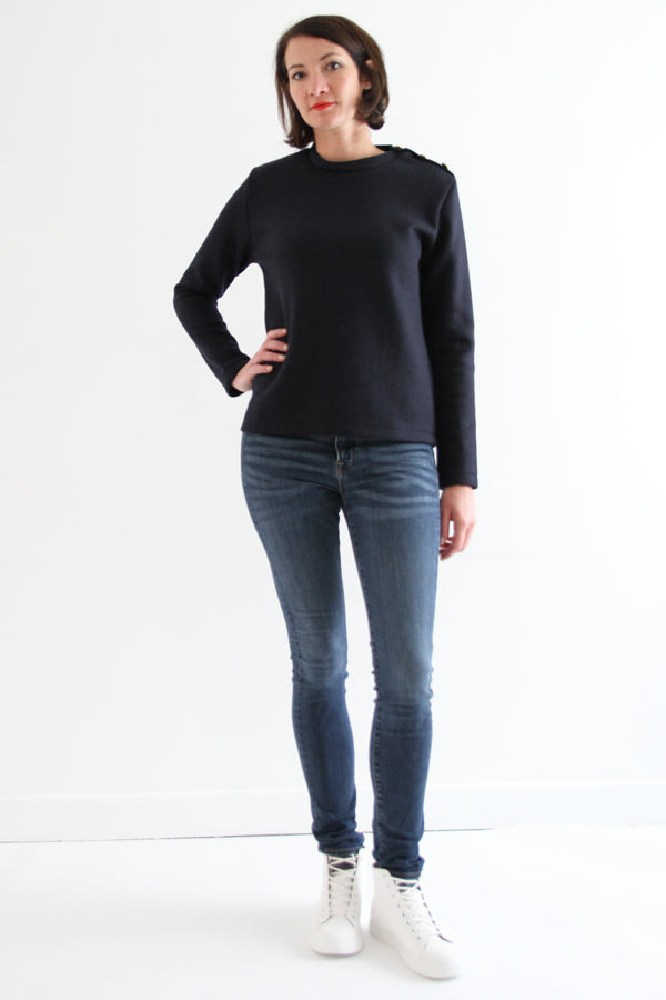 Je suis Emilien, le petit pull marin classique pour femmes. Mon trait de caractère principal est mon ouverture à l’épaule gauche ornée de 3 boutons pression. J’ai des manches longues et une encolure rapportée. Dans un lainage bleu marine, je suis votre compagnon du bord de mer, mais on peut me décliner dans des versions plus sport ou plus urbain avec des jerseys molletonnés ou fantaisies.