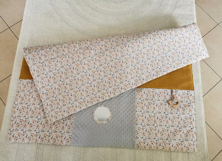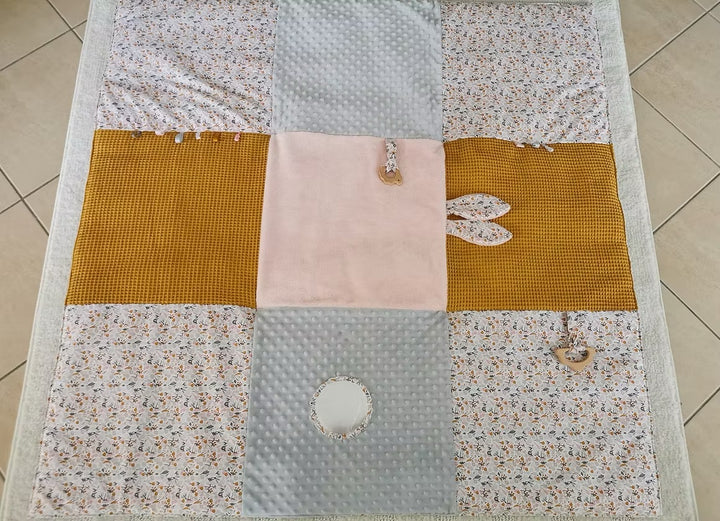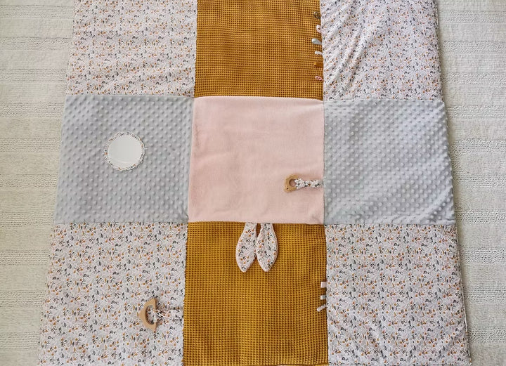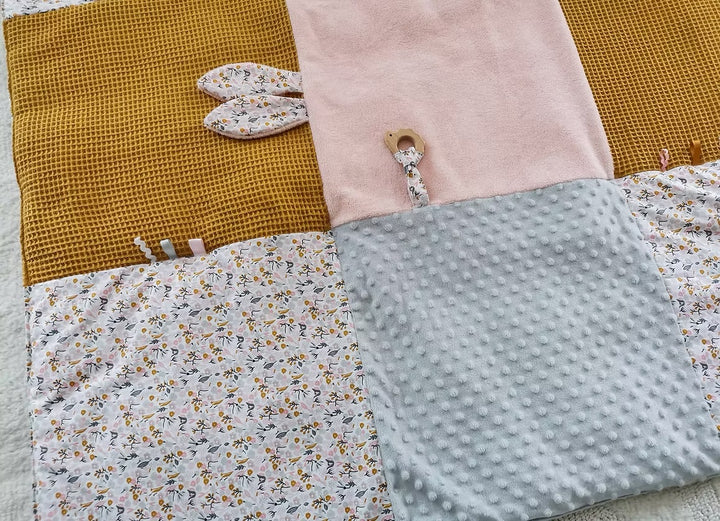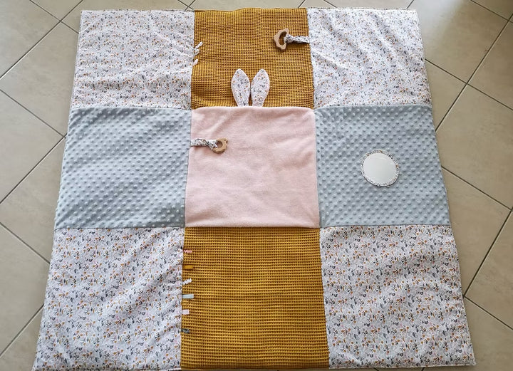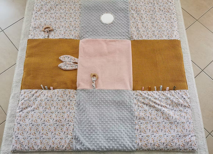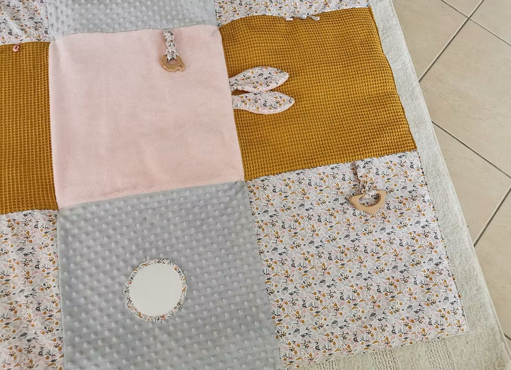 Éveillez les sens de votre bébé avec ce tapis d’éveil sensoriel unique ! Ce patron de couture numérique vous guide pas à pas pour créer un tapis interactif, combinant différentes textures et éléments ludiques, favorisant ainsi le développement tactile et visuel de votre enfant.