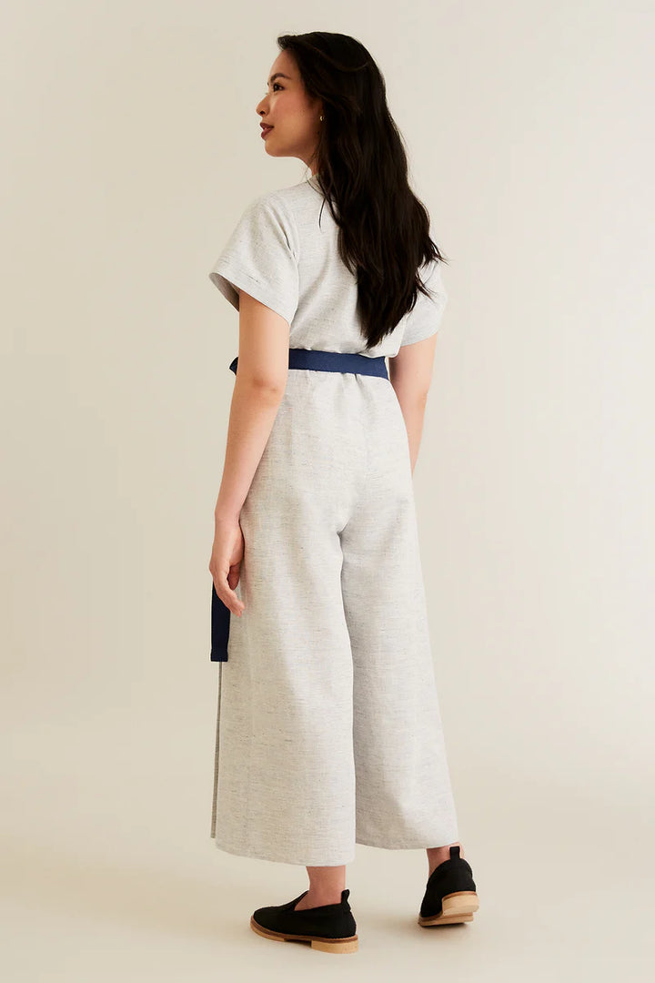 The Hali sewing pattern includes two comfy and stylish wardrobe staples: A wrap dress and jumpsuit. Both variations feature a semi-fitted wrap bodice with a back yoke and a V-neck, wrap tie closure, and handy side pockets.