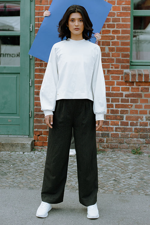 Ce modèle présente de longues manches ballon avec poignets, un col et un ourlet légèrement évasé.