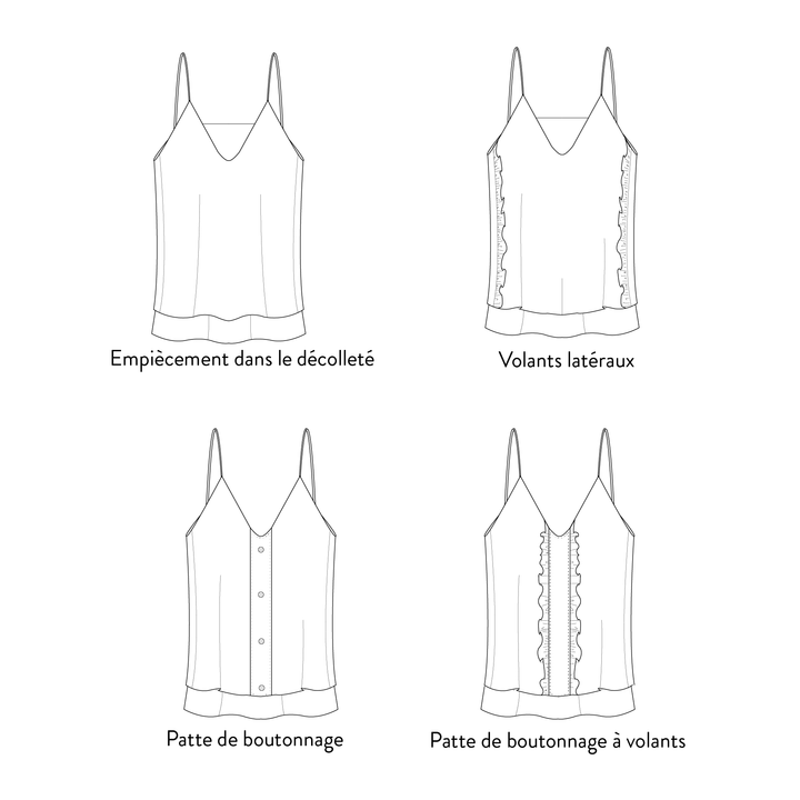 Sa coupe ample et sans pince, avec deux empiècement latéraux, et la possibilité d’ajouter un empiècement dans le décolleté, une patte de boutonnage décorative ou des volants.